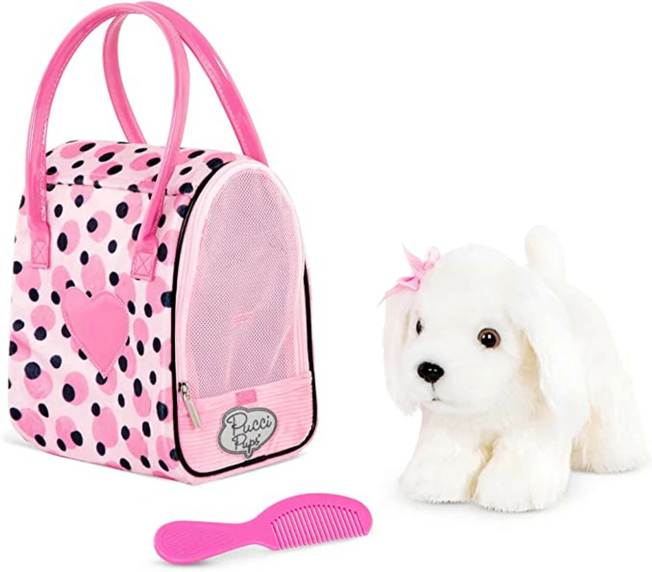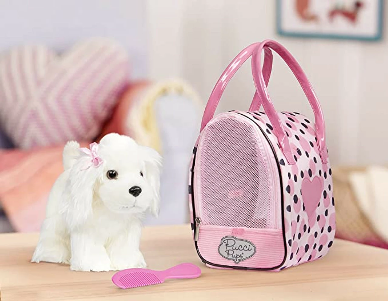 - Includes: 8-inch stuffed animal puppy, a comb and a carrying bag for the dog.